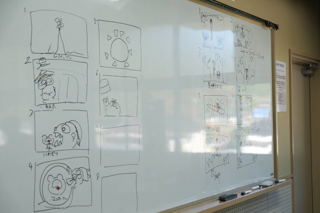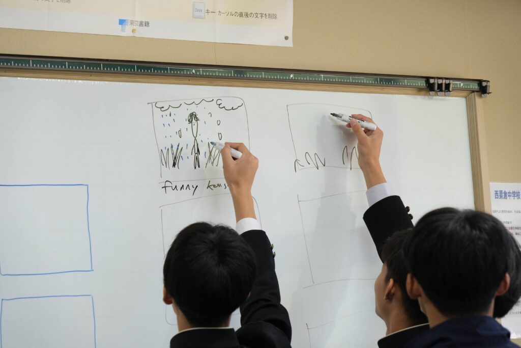 第2回はボビーさんが来校。英語でのアイスブレイクゲームを通じてさらに打ち解けたあとは、動画づくりのプロとして、構成の立て方や撮影時の工夫などを丁寧にレクチャーしてくださいました。生徒たちはラフ画を描き、自分たちのタブレットで撮影を開始。校外へとロケ撮影に出かけるグループもあり、個性豊かな制作が始まりました。