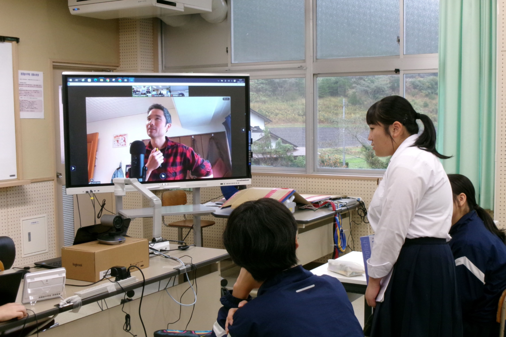 第1回は、オンラインでの事前交流からスタート。生徒たちは少し緊張しつつも、英語で自己紹介ゲームを楽しんだり、事前に考えてきた質問を英語で投げかけたりしました。ボビーさんから「みんなが思う、西粟倉の魅力は?」と問いかけられると、「森!」「人とかじゃない?」とグループごとにテーマを考えました。授業が終わるころには「(ボビーと)仲良くなれた気がする!」と笑顔で手を振る生徒の姿も見られました。