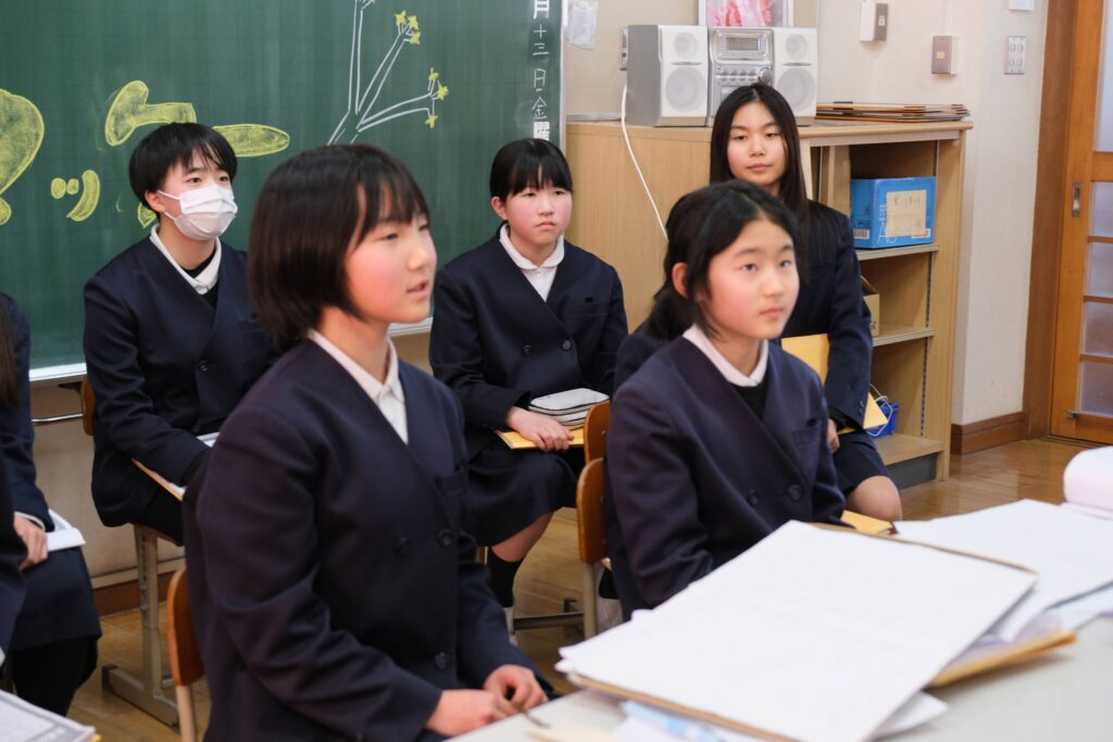 次はお互い質問をしていきます。「どんな力が身につきましたか?」「作ったミツマタ栞はどんなものですか?」「今後取り組みたいことは何ですか?」など様々な質問が飛び交います。すると代表の2人が何を答えたらいいか分からず、黙り込んでしまう場面も。そんなときは後ろの他のメンバーがフリップを持って「こうじゃない?」と2人をサポートしてくれていました。
