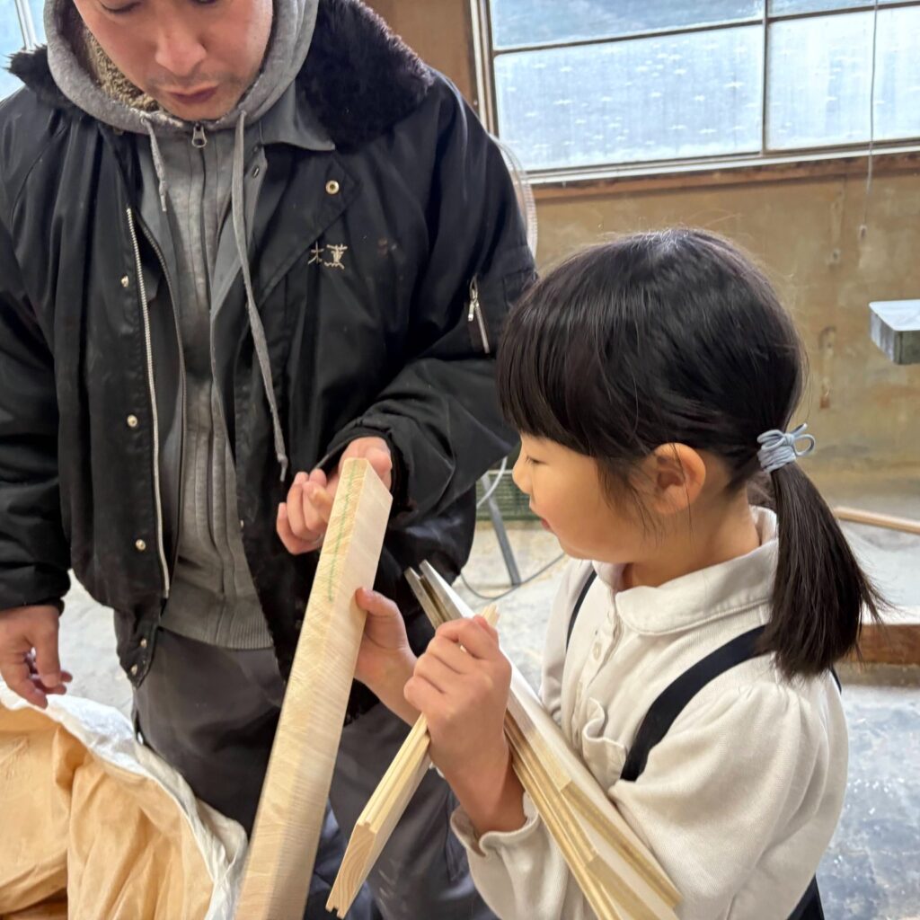次は使う木を準備します。今回は木の里工房木薫さんのご厚意で、端材をいただきに行きました。最初「木は切ったことないから自分じゃ切れない!」と断言していた女の子。しかし、木薫さんに端材をもらいに行った際、いろんな道具を見て加工に興味がわいたのか、「木を切ってみる?」と聞いてみたところ「切ってみたい!」と、糸鋸に初挑戦しました。