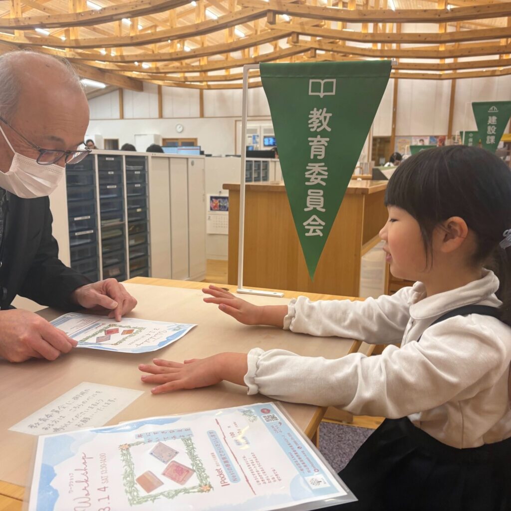 そして迎えた当日。ペンや木の板を机に用意し、木で作った看板を首から下げて準備は万端です。1年生のクラスのみんなにイベント告知をしたおかげもあって、開始前から「まだかな~」とお客さんが。スタートからワークショップの座席は満席になりました。最初は「私も絵を描く!」と絵を描いていましたが、「ペンを取って!」「次はどうしたらいい?」とお客さんの対応に追われながらもワークショップを進めていきました。