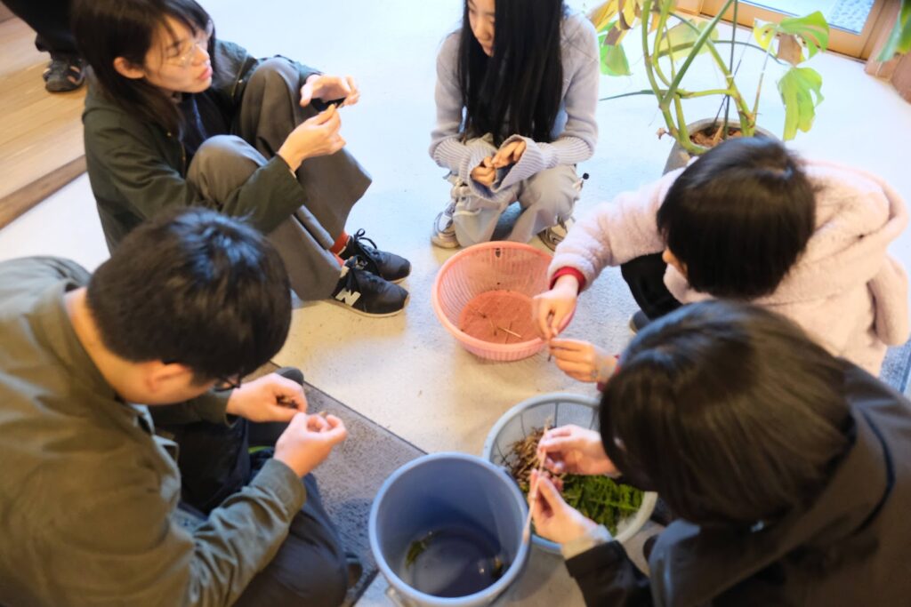 「遊ぶ時間」では、Pocket内で「絵しりとり」や「イラスト伝言ゲーム」で盛り上がったり、「いい天気だから外へ野草探しに行くのはどう?」という提案から、急遽Pocket号に乗って、野草探しのプチ冒険へ!つくし、スギナ、たんぽぽ、スイバ、フキノトウ… 田んぼのあぜや、公園、土手にたくさん生えているのを見て、時間を忘れて手を動かす参加者たち。図鑑を見ながら「これ食べれるやつ?」と見合わせながら、バケツにたくさん採った野草を入れて、Pocketへ持って帰りました。