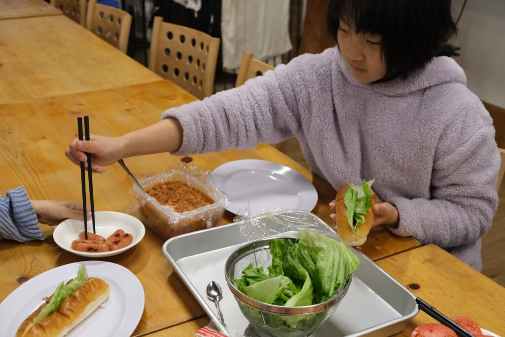 次の日の朝、企画者自ら参加者を起こして、朝ごはんに「ホットドック」をつくりました。トマトとレタスをたくさん挟んで、セルフでどうぞ!その後は、就寝前に盛り上がりを見せた「トランプ」で遊び、会を締めくくりました。