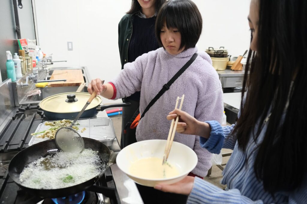 夕食は「ミートソーススパゲッティ」と、採って帰ってきた「野草の天ぷら」です。厨房では、初めて厨房を使う参加者に企画者は「玉ねぎを包丁でみじん切りにしてください」「お皿はあそこにあるよ」と率先して指示を出してくれました。はじめて見る野草を天ぷら粉につけて油に入れた瞬間は「わー!」と思わず声が出ていました。