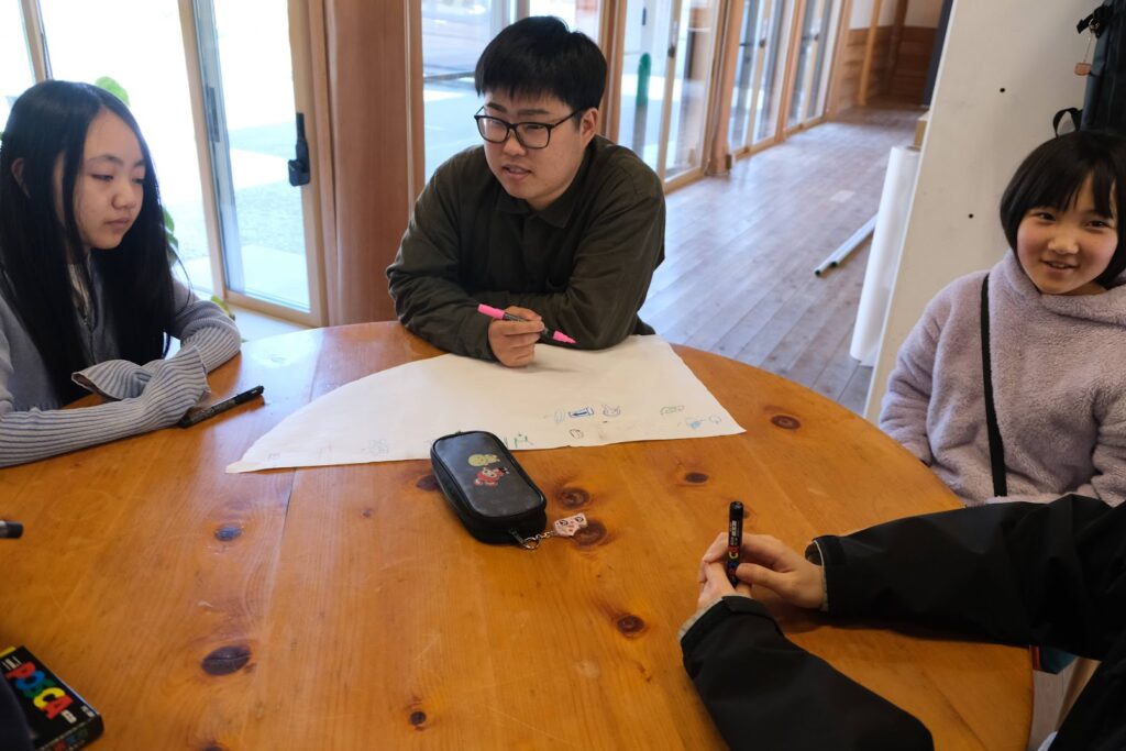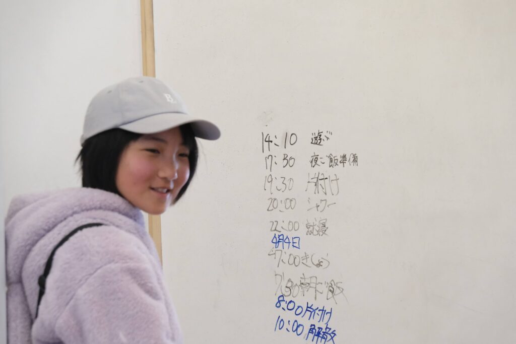 まずは企画者によるスケジュールの確認。シンプルなお泊り会なので、「遊ぶ」「夕ご飯準備」「就寝」というシンプルな工程でしたが、そのなかでも参加者の要望を聞きながら「遊ぶ時間はなにしたいですか?」と提案したり、「これから絵しりとりしようと思うんだけど、いいですか?」と聞いたり、企画者は参加者みんなが楽しめるようなお泊り会をつくってくれている様子が印象的でした。
